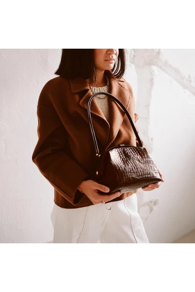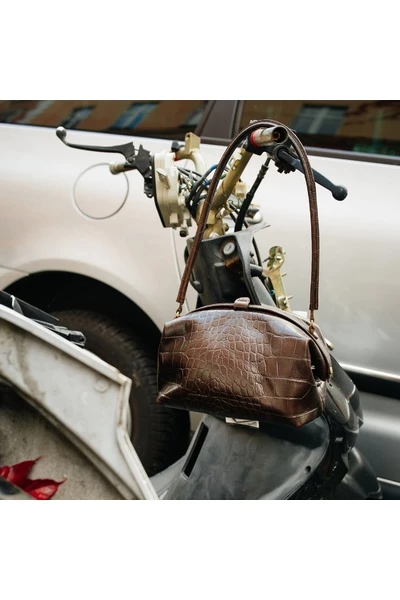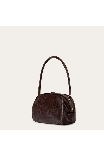 Bruin krokodilpatroon. Het is zorgvuldig met de hand genaaid van hoogwaardig plantaardig gelooid rundleer en heeft geen voering of binnenzakken. De knuffeltas heeft een afgerond sikkelvormig handvat. Het sluit met een clip en hangt stevig aan een korte, niet-verstelbare riem.